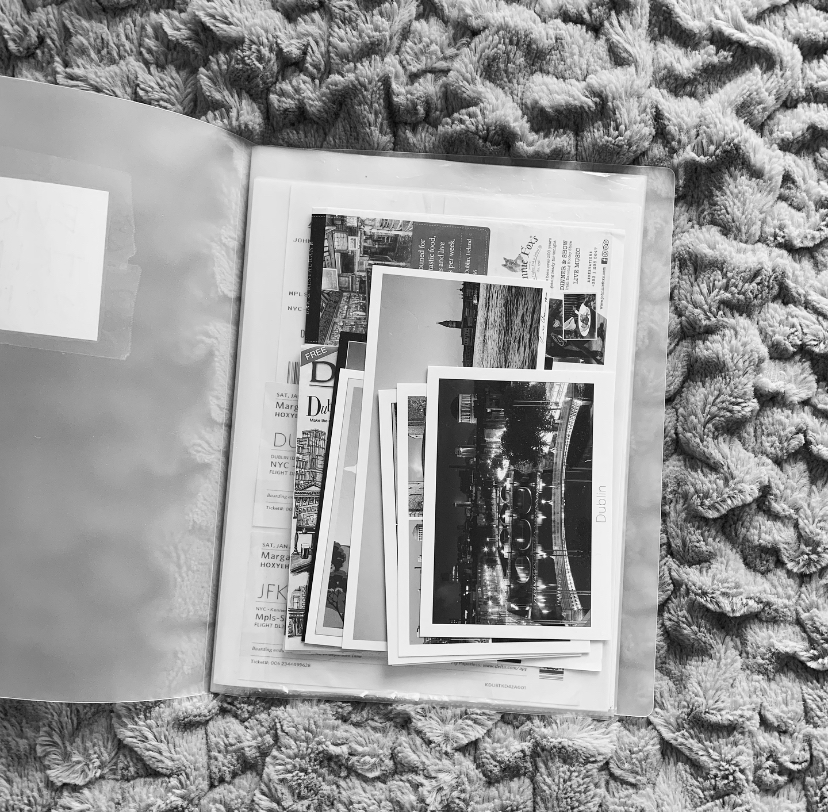 This is a good option for longer trips (think 10 days to a few weeks), where I typically would want to be journaling and saving everything from coasters to tickets to postcards. For my euro trip in January, I bought a small portfolio with clear sleeves, and filled it with my postcards, receipts/etc., the full trip itinerary with all my notes, and my journal from those days (I ripped the pages out of the notebook). It’s the perfect size and lovely to look back on all in one spot.