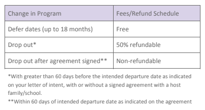If you need to defer your dates, you may do so at no extra cost (up to 2 years). If you decide to drop out of the program after you’ve attended orientation and your intended departure date as indicated on your letter of intent is more than 60 days away, you are eligible for a 50% refund of the program cost. The non-refundable balance is valid for up to 2 years from your original intended departure date. This amount is also transferable to a friend if you are no longer able to participate in the program. If you decide to drop out before you have signed an agreement and your intended departure date as indicated on your letter of intent is more than 60 days away, you are eligible for a 50% refund of the program cost. If you decide to drop out after you have signed an agreement (either with a host family or school) and your intended departure date as indicated on the agreement is in less than 60 days, your program fee is not refundable. Once contracts have been signed and the intended departure date is in less than 60 days, all refund opportunities are forfeited. To better understand the potential refund schedule, please see the table below: